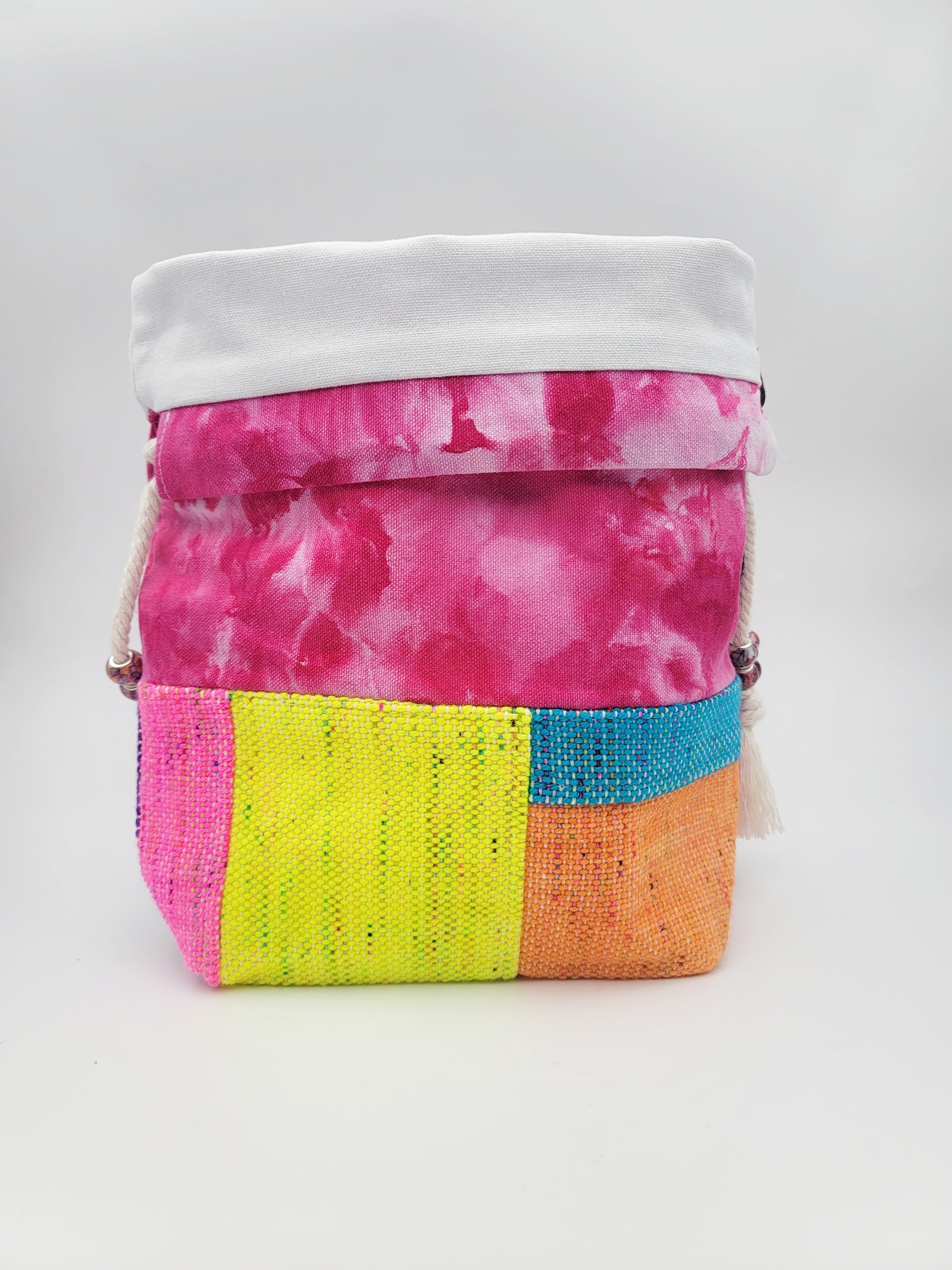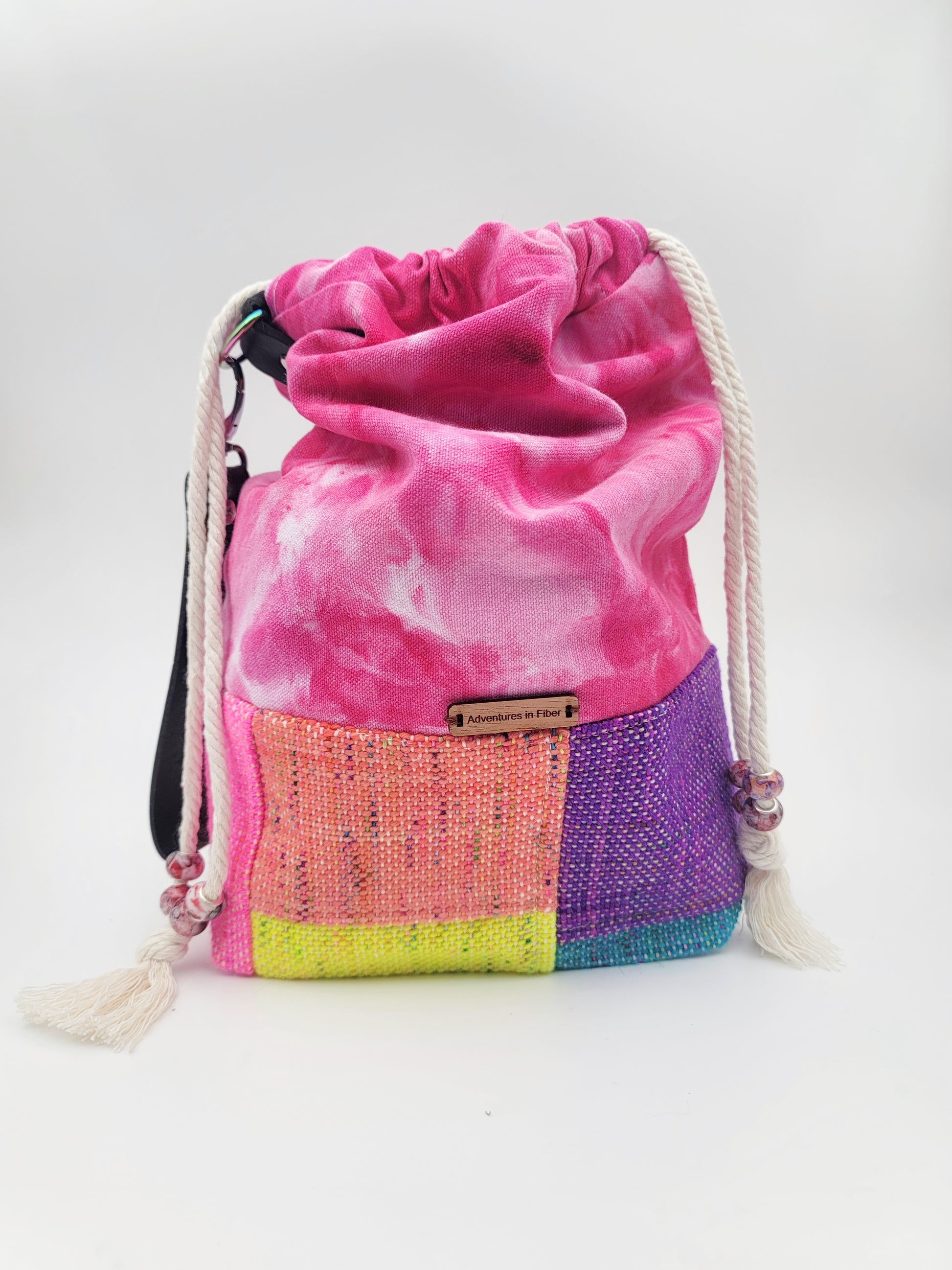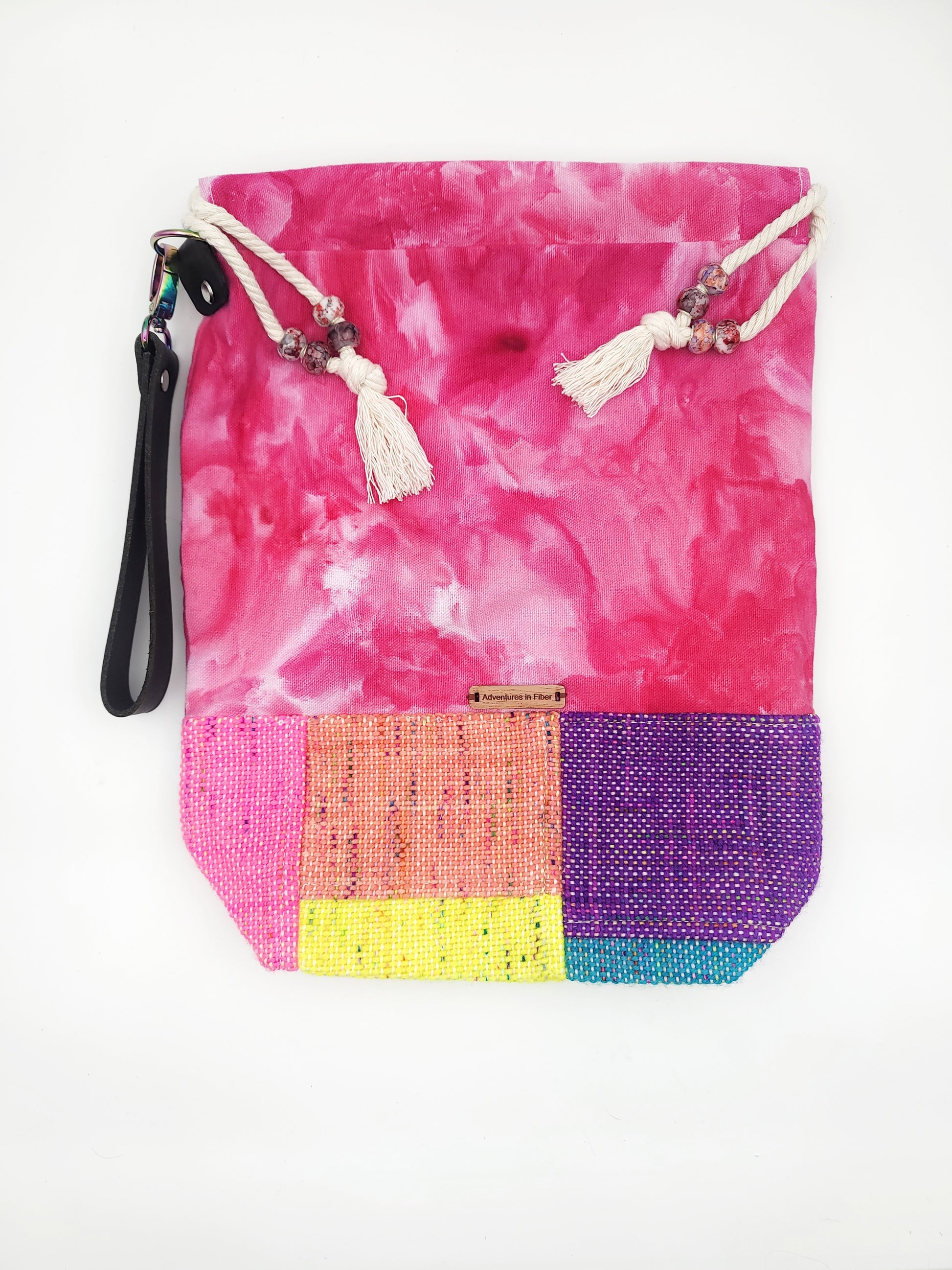 The large drawstring bag is the ideal size for 4 to 5 skein projects, making it perfect for creating large shawls and sweaters. Crafted from handwoven panels and/or ice-dyed fabrics, each bag is unique and fully lined with interior pockets for organization. It also features cotton rope drawstrings and a leather wrist strap for easy use. Complete your crafting kit by pairing it with our small & large notions pouches!